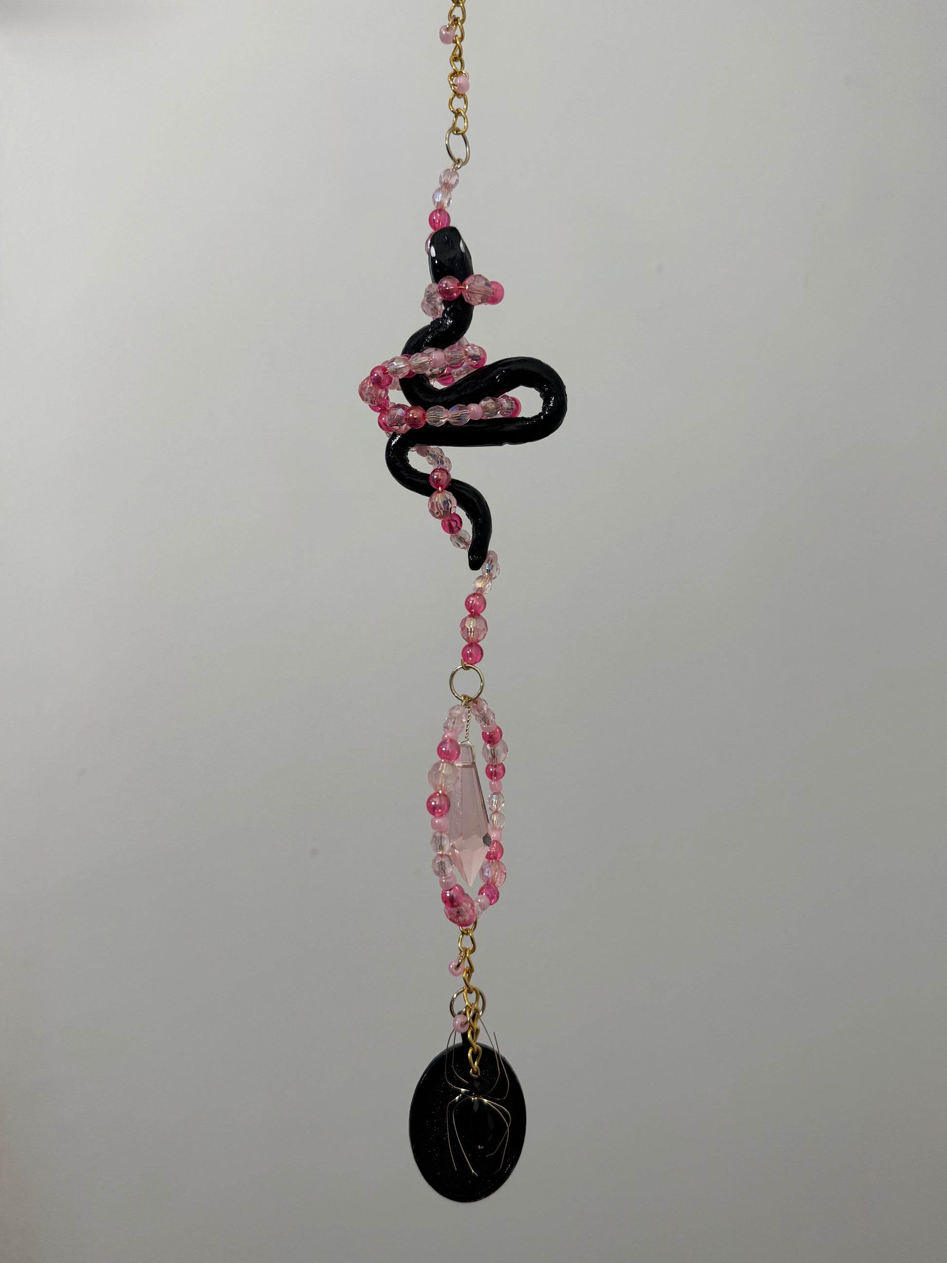 Enhance your home decor with our Edith Suncatcher. Featuring a long pink and black design, this Suncatcher adds a touch of elegance to any room. Made with high quality materials, it brightens up any space with vibrant colors. Bring in the sunshine with Edith.