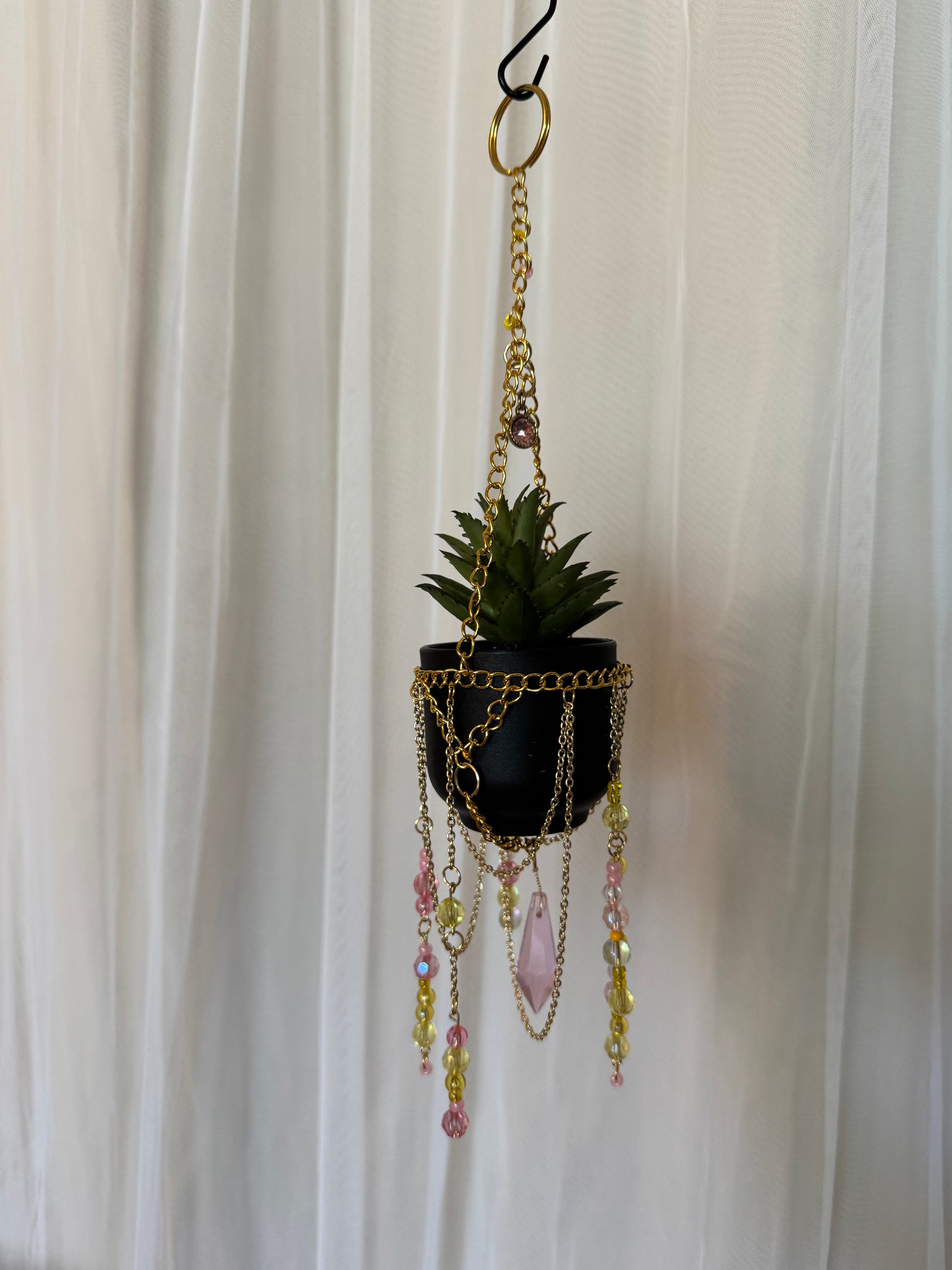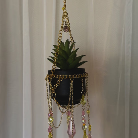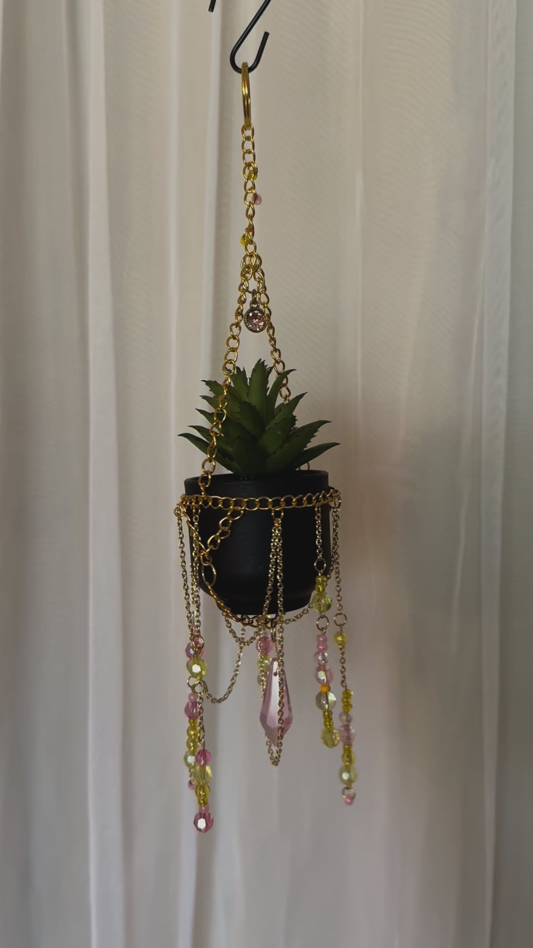 The Mini Daphne is the perfect addition to any room, adding a touch of elegance and natural beauty. At just 12 inches in height, this miniature plant chandelier suncatcher is easy to hang and requires minimal maintenance. Its pink and yellow color combination, paired with the gold accents, creates a stunning visual display. Elevate your space with the Mini Daphne today.