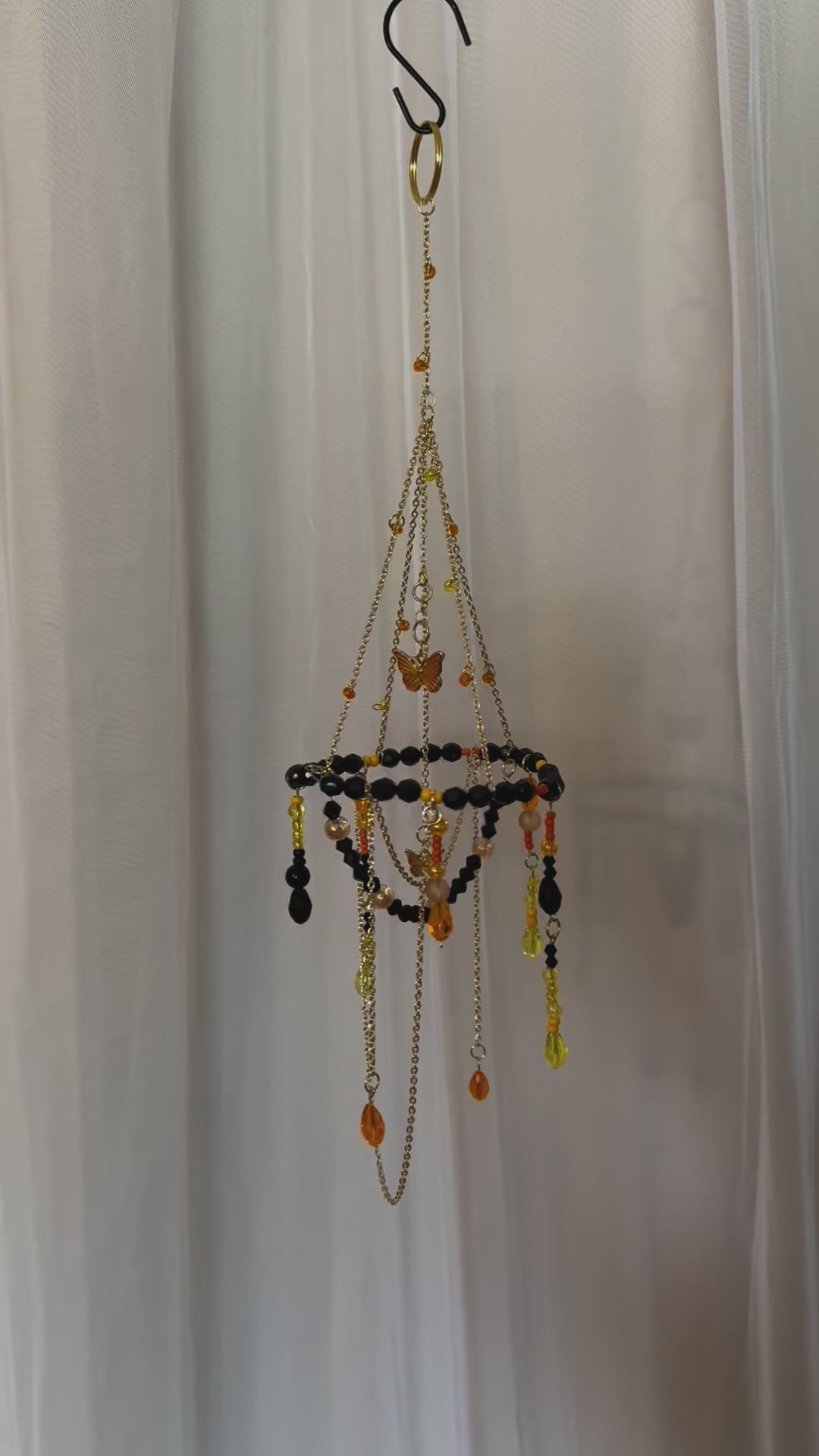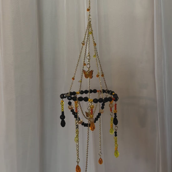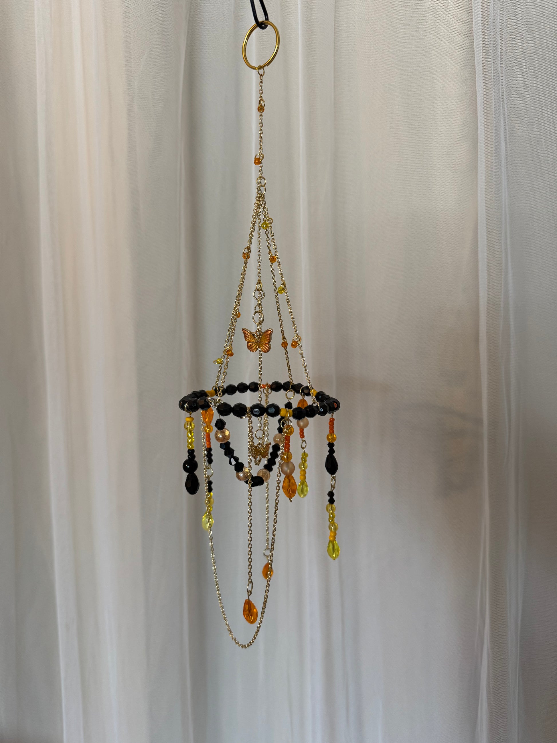 Transform your space into a vibrant, summery oasis with our Seville C. Chandelier sun catcher. Adorned with orange, yellow, and black with butterfly charms, this gold catcher captures the warmth and beauty of summer. Perfect for adding a touch of color and charm to any room.
