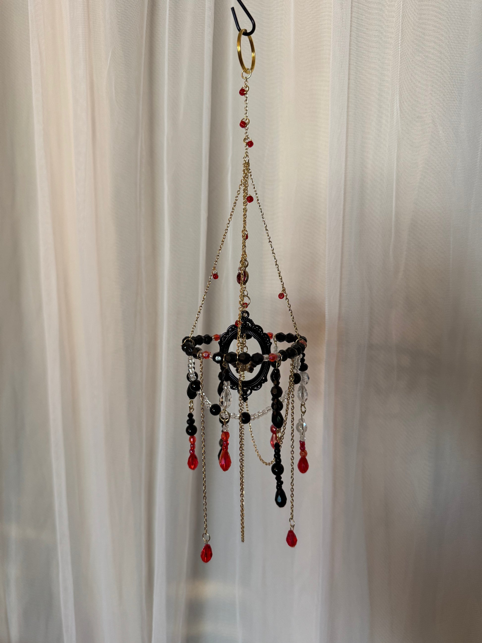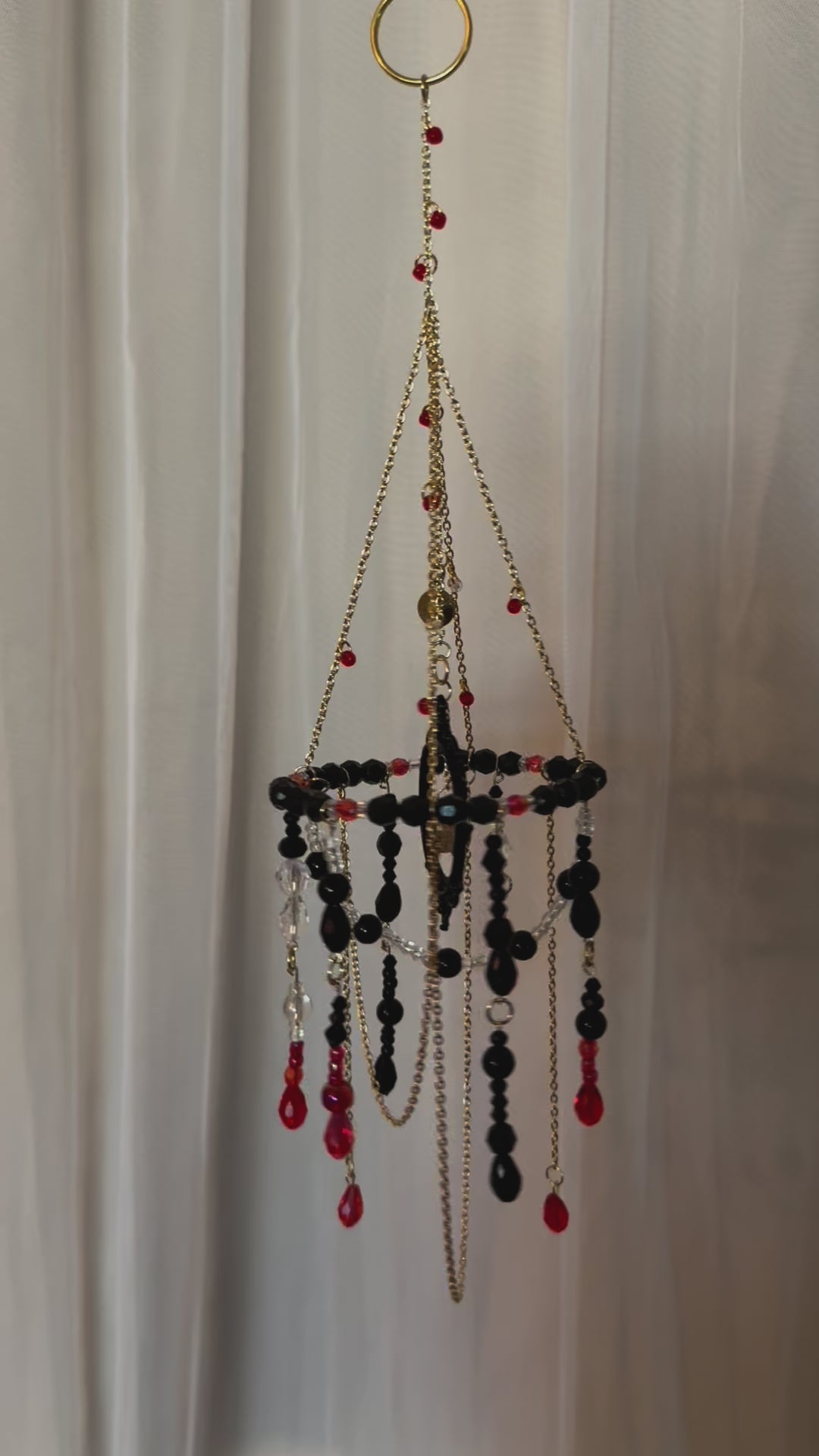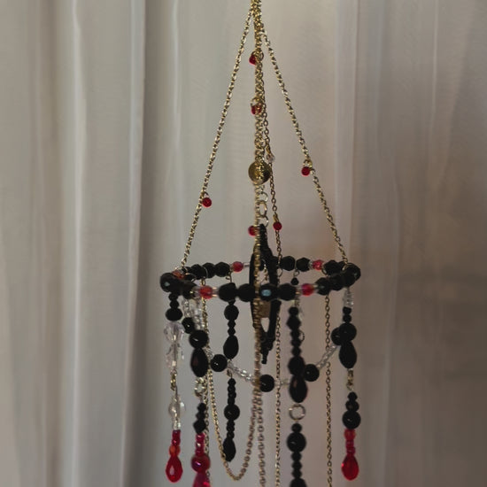 The Theodora Chandelier sun catcher is a beautiful addition to any room. Its vintage gold and black finish, paired with red and clear accents, creates a stunning contrast that catches the eye. With its miniature chandelier and butterfly design, it also makes for a charming sun catcher. Elevate your space with this one-of-a-kind piece.