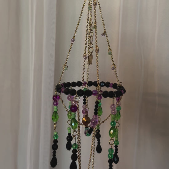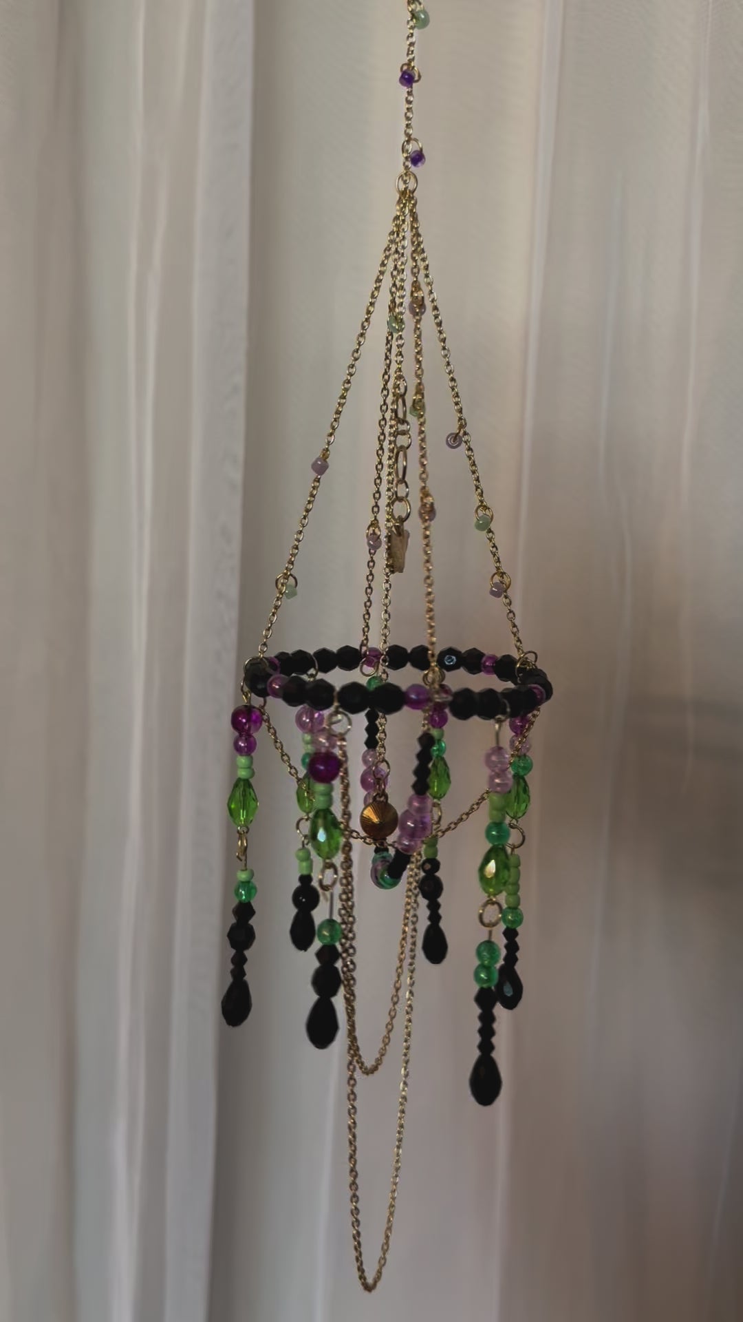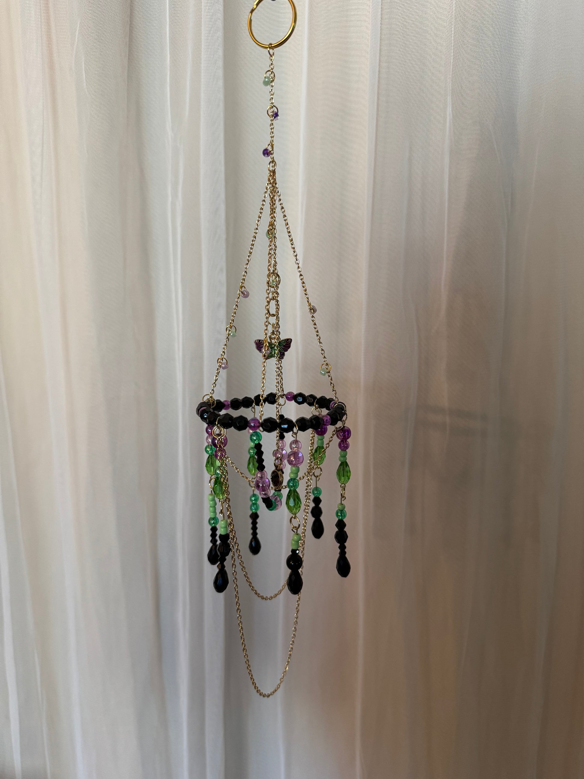 Add a touch of elegance to any room with the Royal Chandelier Suncatcher in beautiful green and purple hues. The intricate design and sparkling crystals create a stunning display while the sun's rays shine through, making for a mesmerizing and relaxing experience. Perfect for adding a pop of color and sophistication to your home decor.